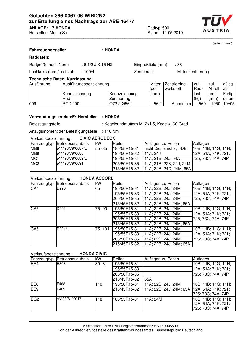 Dieses Gutachten (abe) bezieht sich auf die Alufelge brand-momo 500 in der Ausführung 2Jx15 ET 0, Mittenloch 0 mm (KBA 46477). Im PDF findest du typischerweise zulässige Reifengrößen, Auflagen/Anbauhinweise und – je nach Dokument – Hinweise zur Eintragung.
