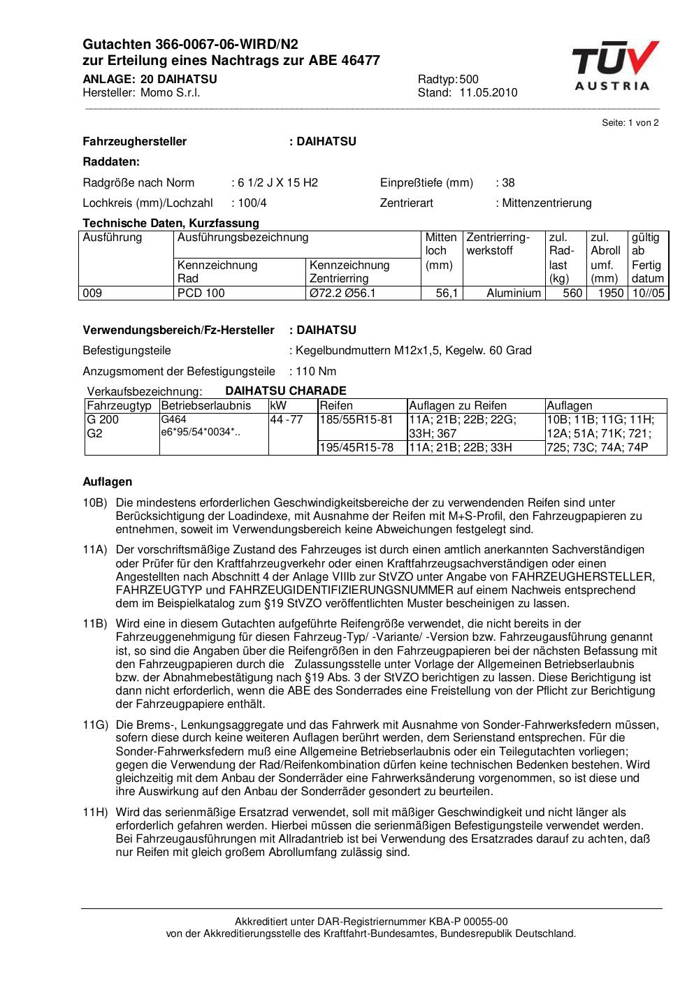 Dieses Gutachten (abe) bezieht sich auf die Alufelge brand-momo 500 in der Ausführung 2Jx15 ET 0, Mittenloch 0 mm (KBA 46477). Im PDF findest du typischerweise zulässige Reifengrößen, Auflagen/Anbauhinweise und – je nach Dokument – Hinweise zur Eintragung.
