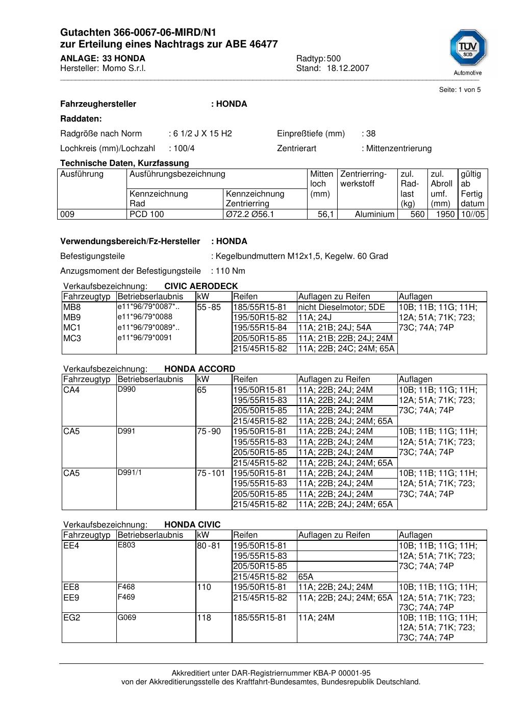 Dieses Gutachten (abe) bezieht sich auf die Alufelge brand-momo 500 in der Ausführung 2Jx15 ET 0, Mittenloch 0 mm (KBA 46477). Im PDF findest du typischerweise zulässige Reifengrößen, Auflagen/Anbauhinweise und – je nach Dokument – Hinweise zur Eintragung.