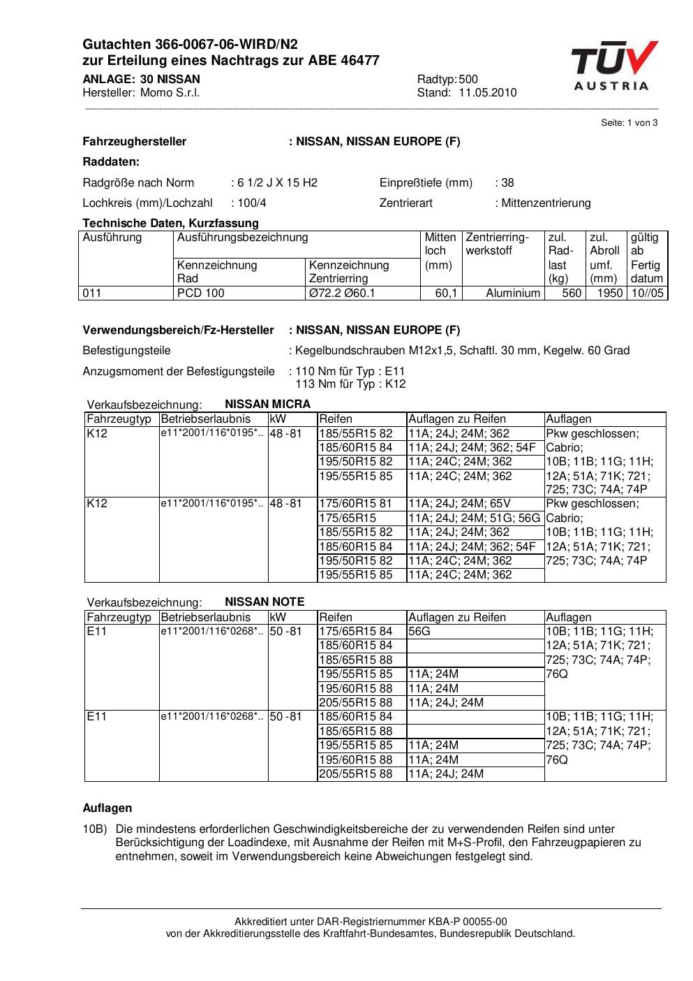 Dieses Gutachten (abe) bezieht sich auf die Alufelge brand-momo 500 in der Ausführung 2Jx15 ET 0, Mittenloch 0 mm (KBA 46477). Im PDF findest du typischerweise zulässige Reifengrößen, Auflagen/Anbauhinweise und – je nach Dokument – Hinweise zur Eintragung.