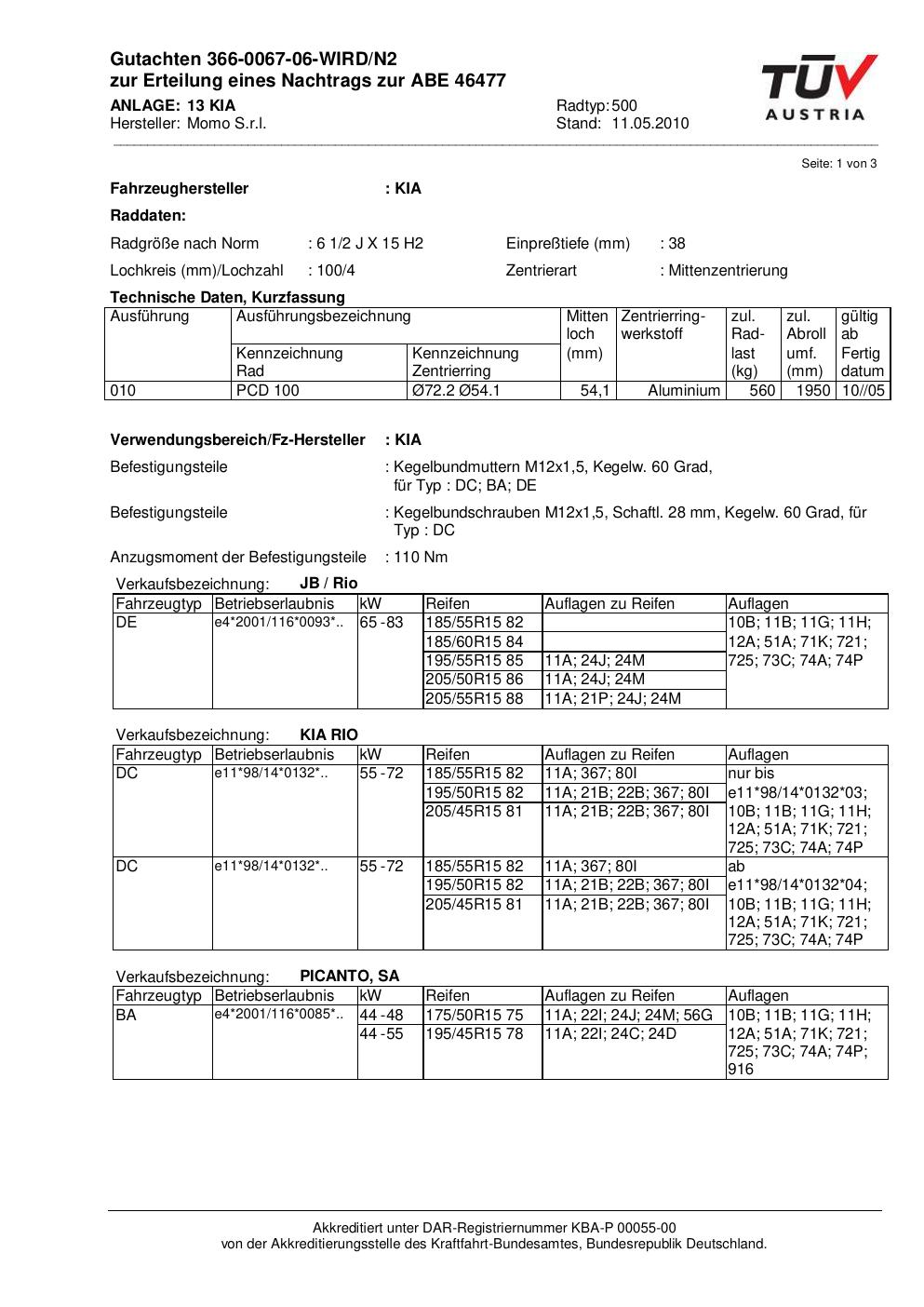 Dieses Gutachten (abe) bezieht sich auf die Alufelge brand-momo 500 in der Ausführung 2Jx15 ET 0, Mittenloch 0 mm (KBA 46477). Im PDF findest du typischerweise zulässige Reifengrößen, Auflagen/Anbauhinweise und – je nach Dokument – Hinweise zur Eintragung.