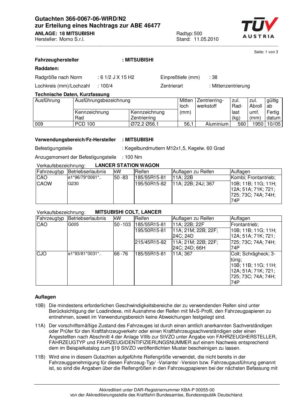 Dieses Gutachten (abe) bezieht sich auf die Alufelge brand-momo 500 in der Ausführung 2Jx15 ET 0, Mittenloch 0 mm (KBA 46477). Im PDF findest du typischerweise zulässige Reifengrößen, Auflagen/Anbauhinweise und – je nach Dokument – Hinweise zur Eintragung.