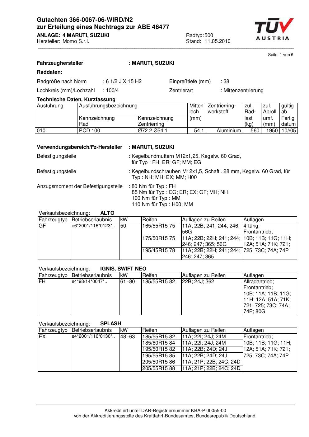 Dieses Gutachten (abe) bezieht sich auf die Alufelge brand-momo 500 in der Ausführung 2Jx15 ET 0, Mittenloch 0 mm (KBA 46477). Im PDF findest du typischerweise zulässige Reifengrößen, Auflagen/Anbauhinweise und – je nach Dokument – Hinweise zur Eintragung.