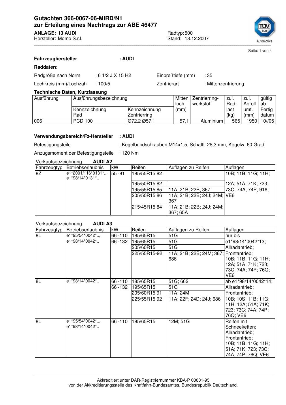 Dieses Gutachten (abe) bezieht sich auf die Alufelge brand-momo 500 in der Ausführung 2Jx15 ET 0, Mittenloch 0 mm (KBA 46477). Im PDF findest du typischerweise zulässige Reifengrößen, Auflagen/Anbauhinweise und – je nach Dokument – Hinweise zur Eintragung.
