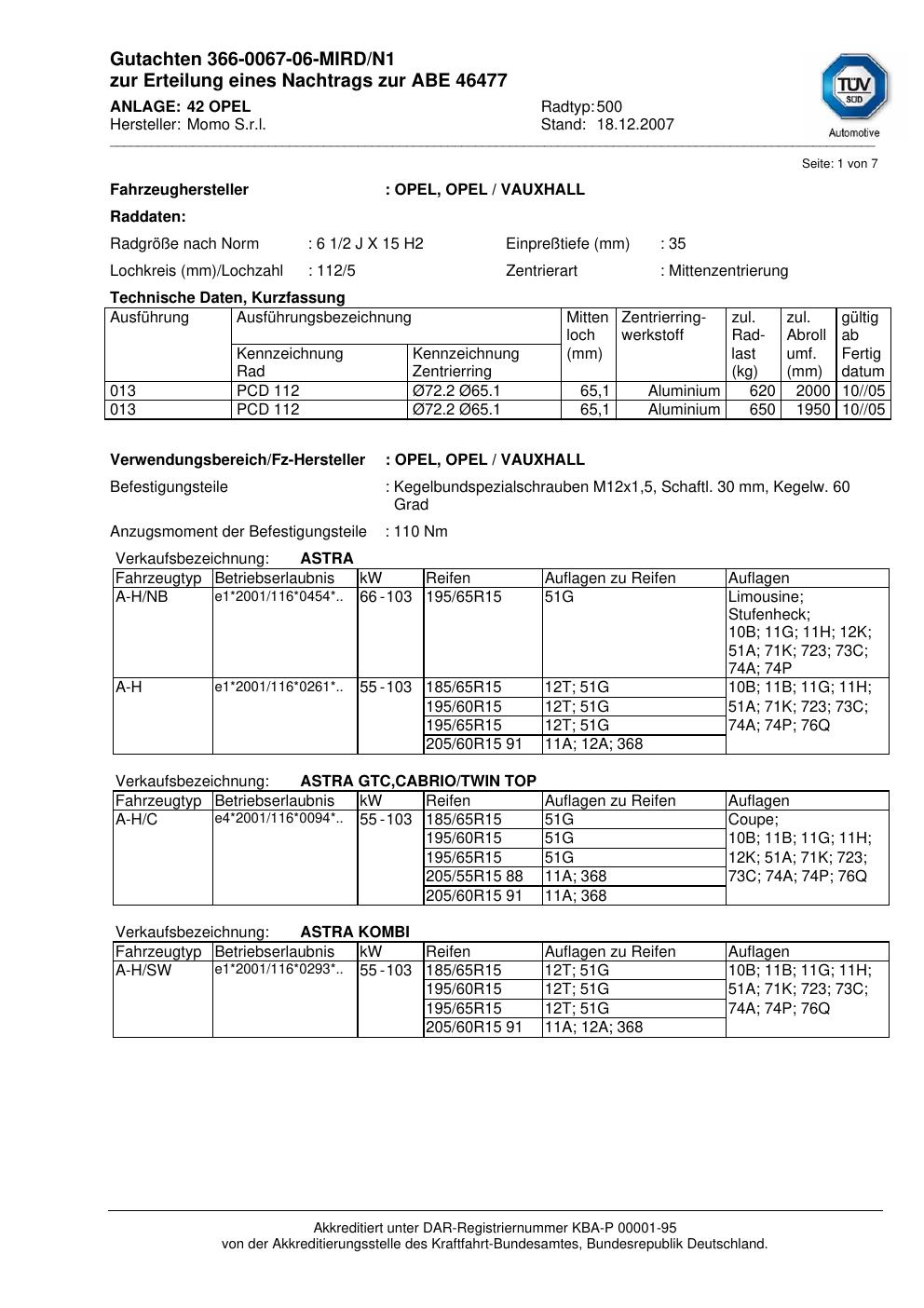 Dieses Gutachten (abe) bezieht sich auf die Alufelge brand-momo 500 in der Ausführung 2Jx15 ET 0, Mittenloch 0 mm (KBA 46477). Im PDF findest du typischerweise zulässige Reifengrößen, Auflagen/Anbauhinweise und – je nach Dokument – Hinweise zur Eintragung.