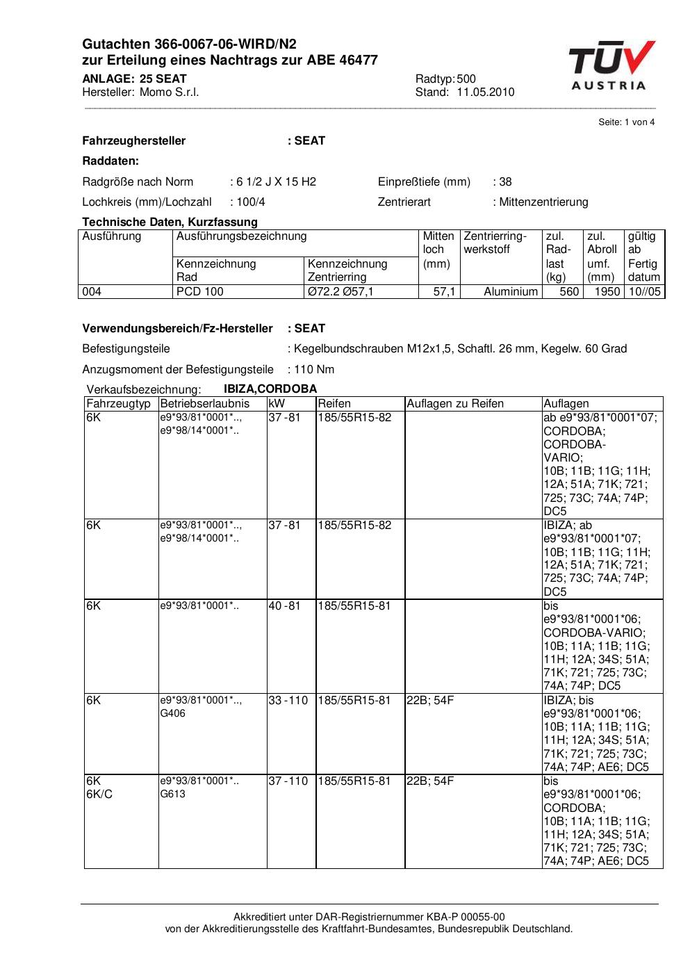 Dieses Gutachten (abe) bezieht sich auf die Alufelge brand-momo 500 in der Ausführung 2Jx15 ET 0, Mittenloch 0 mm (KBA 46477). Im PDF findest du typischerweise zulässige Reifengrößen, Auflagen/Anbauhinweise und – je nach Dokument – Hinweise zur Eintragung.