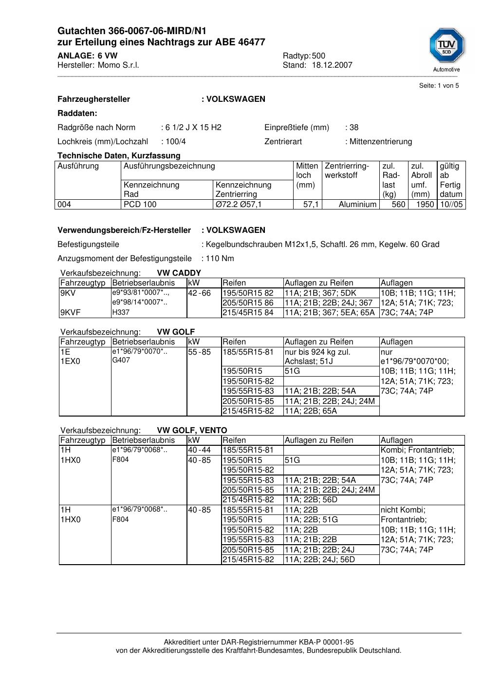 Dieses Gutachten (abe) bezieht sich auf die Alufelge brand-momo 500 in der Ausführung 2Jx15 ET 0, Mittenloch 0 mm (KBA 46477). Im PDF findest du typischerweise zulässige Reifengrößen, Auflagen/Anbauhinweise und – je nach Dokument – Hinweise zur Eintragung.