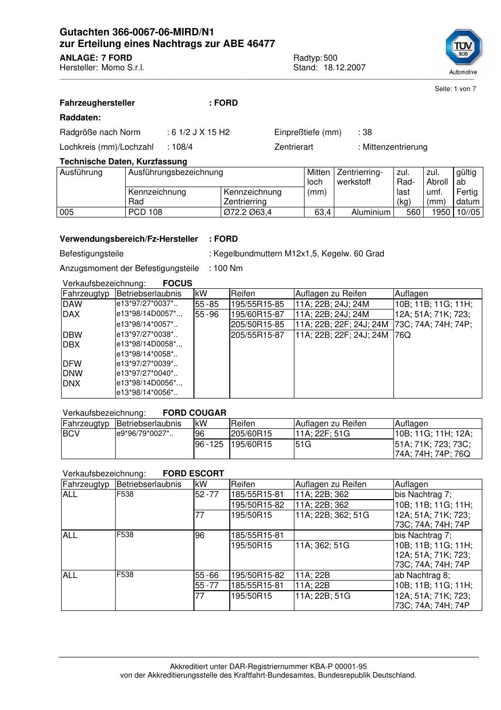Dieses Gutachten (abe) bezieht sich auf die Alufelge brand-momo 500 in der Ausführung 2Jx15 ET 0, Mittenloch 0 mm (KBA 46477). Im PDF findest du typischerweise zulässige Reifengrößen, Auflagen/Anbauhinweise und – je nach Dokument – Hinweise zur Eintragung.
