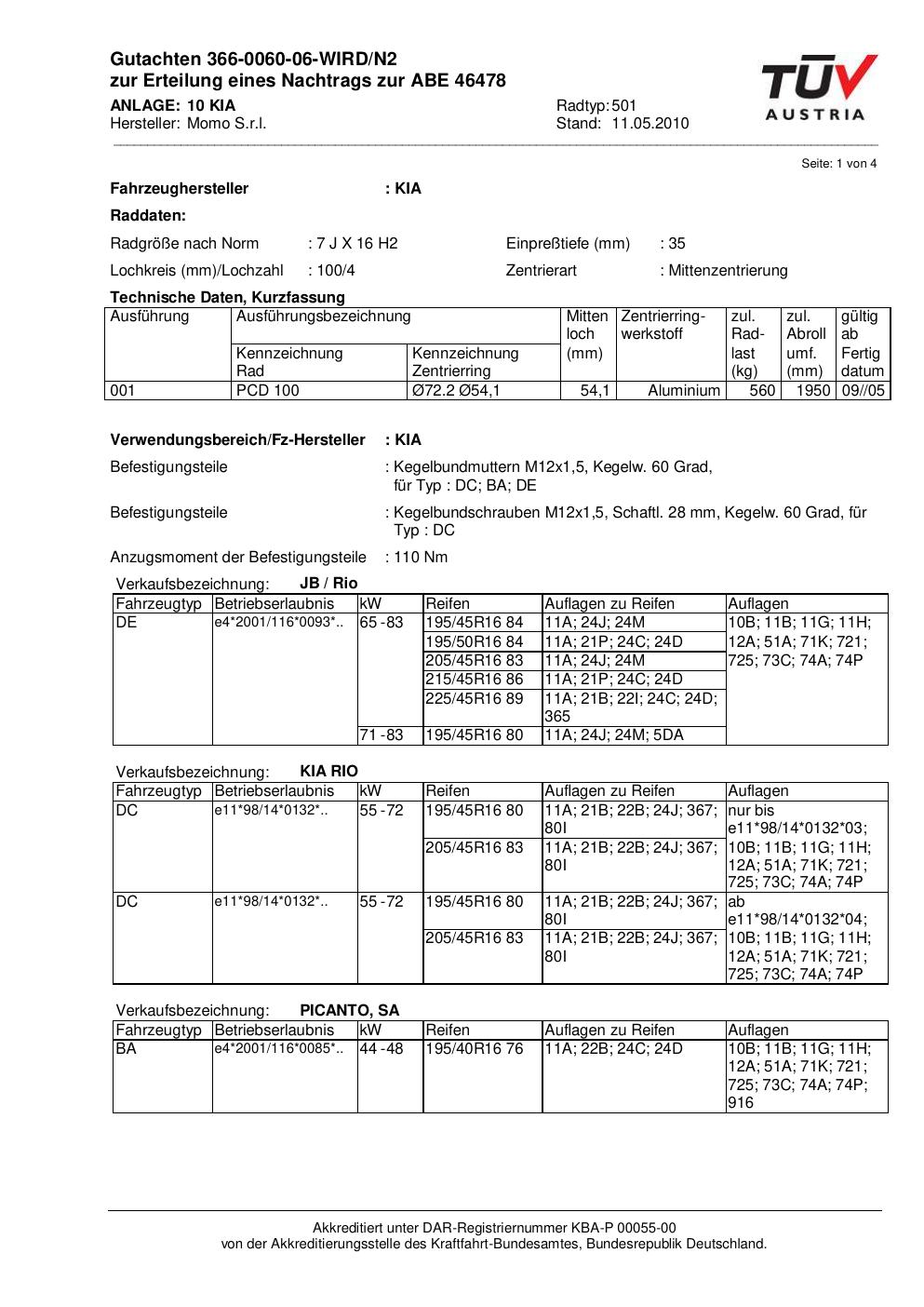 Dieses Gutachten (abe) bezieht sich auf die Alufelge brand-momo 501 in der Ausführung 7Jx16 ET 0, Mittenloch 0 mm (KBA 46478). Im PDF findest du typischerweise zulässige Reifengrößen, Auflagen/Anbauhinweise und – je nach Dokument – Hinweise zur Eintragung.