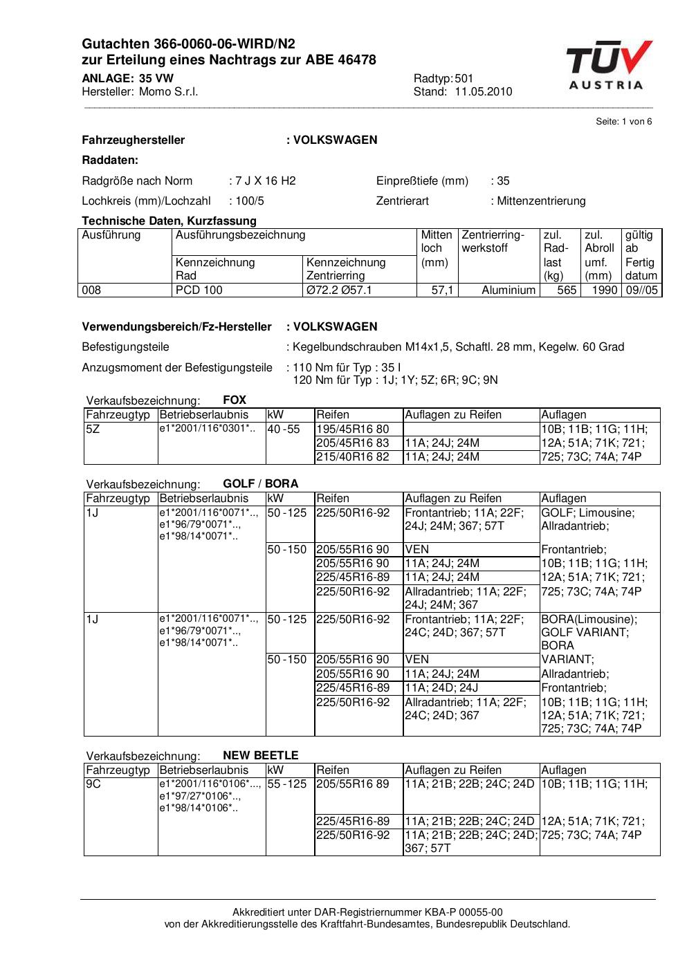 Dieses Gutachten (abe) bezieht sich auf die Alufelge brand-momo 501 in der Ausführung 7Jx16 ET 0, Mittenloch 0 mm (KBA 46478). Im PDF findest du typischerweise zulässige Reifengrößen, Auflagen/Anbauhinweise und – je nach Dokument – Hinweise zur Eintragung.