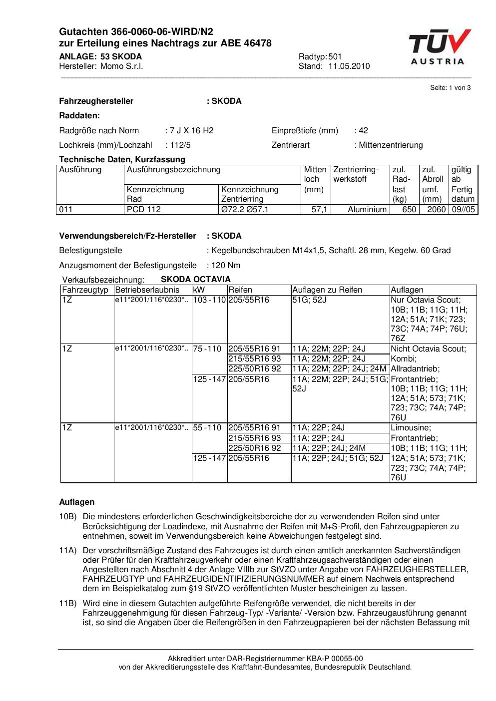 Dieses Gutachten (abe) bezieht sich auf die Alufelge brand-momo 501 in der Ausführung 7Jx16 ET 0, Mittenloch 0 mm (KBA 46478). Im PDF findest du typischerweise zulässige Reifengrößen, Auflagen/Anbauhinweise und – je nach Dokument – Hinweise zur Eintragung.