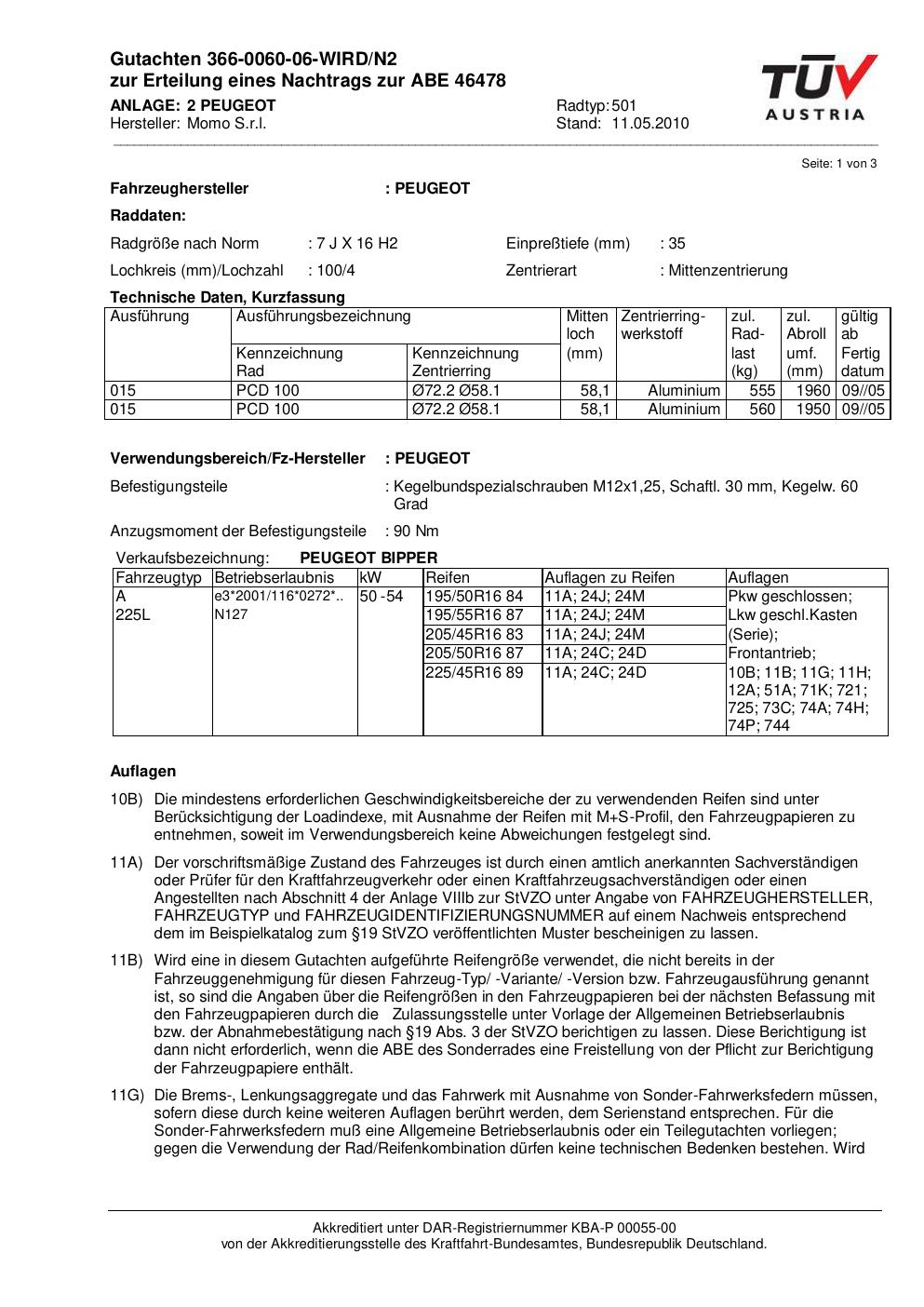 Dieses Gutachten (abe) bezieht sich auf die Alufelge brand-momo 501 in der Ausführung 7Jx16 ET 0, Mittenloch 0 mm (KBA 46478). Im PDF findest du typischerweise zulässige Reifengrößen, Auflagen/Anbauhinweise und – je nach Dokument – Hinweise zur Eintragung.