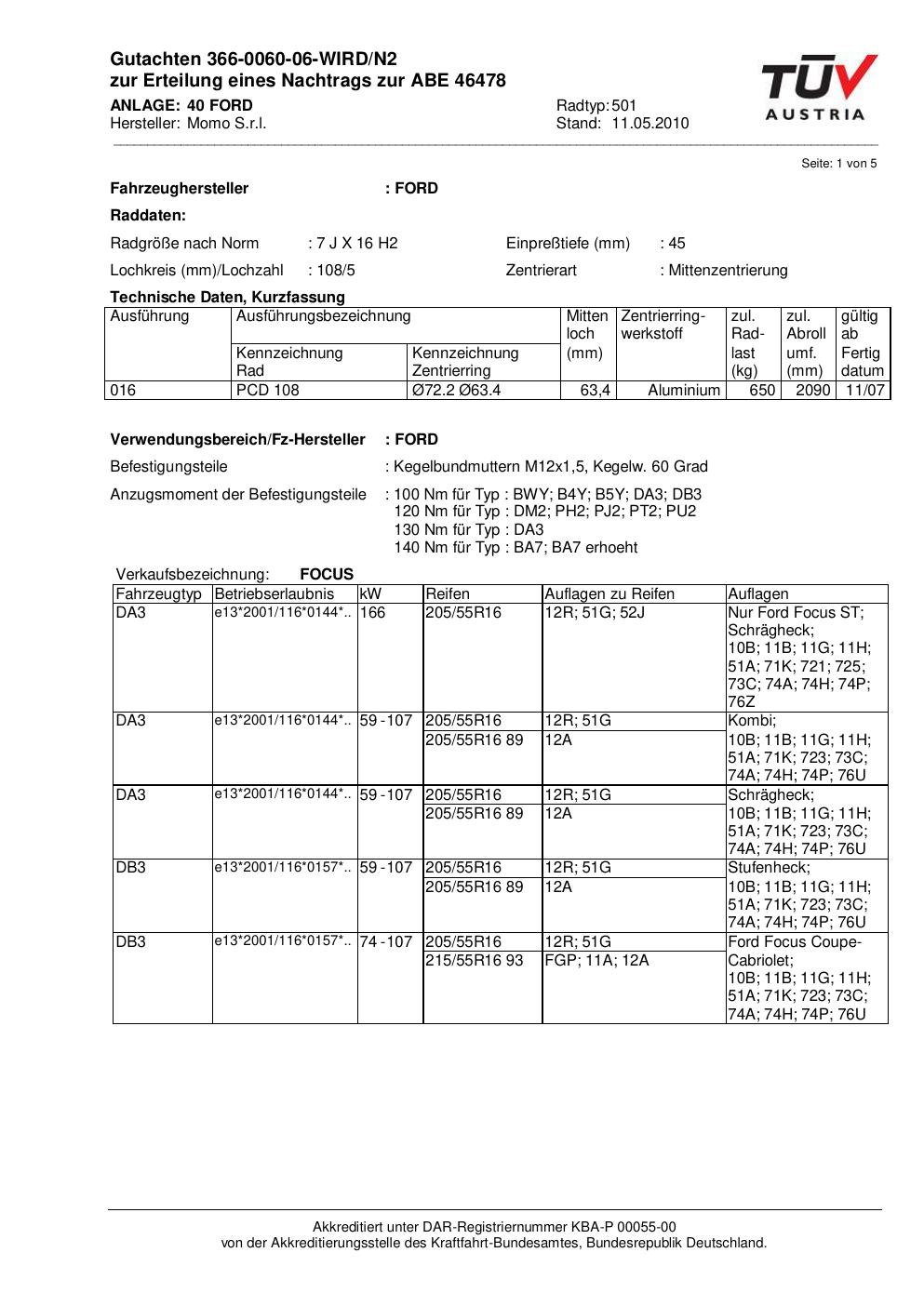 Dieses Gutachten (abe) bezieht sich auf die Alufelge brand-momo 501 in der Ausführung 7Jx16 ET 0, Mittenloch 0 mm (KBA 46478). Im PDF findest du typischerweise zulässige Reifengrößen, Auflagen/Anbauhinweise und – je nach Dokument – Hinweise zur Eintragung.