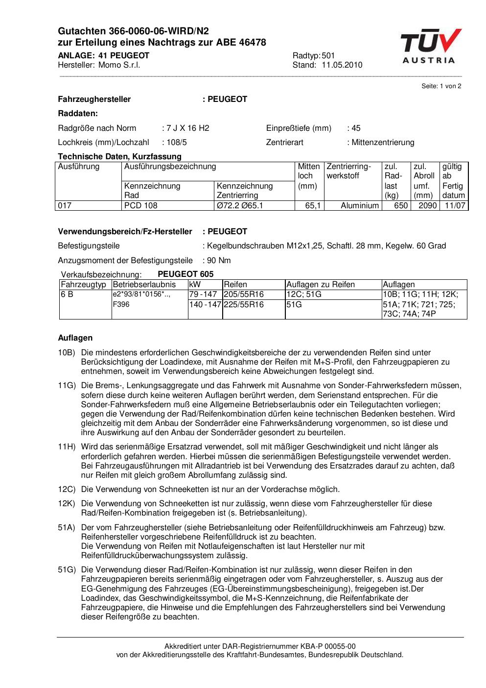 Dieses Gutachten (abe) bezieht sich auf die Alufelge brand-momo 501 in der Ausführung 7Jx16 ET 0, Mittenloch 0 mm (KBA 46478). Im PDF findest du typischerweise zulässige Reifengrößen, Auflagen/Anbauhinweise und – je nach Dokument – Hinweise zur Eintragung.