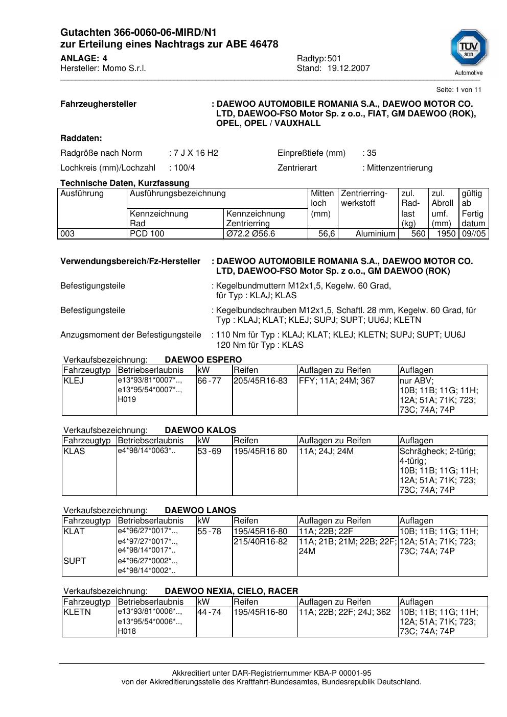 Dieses Gutachten (abe) bezieht sich auf die Alufelge brand-momo 501 in der Ausführung 7Jx16 ET 0, Mittenloch 0 mm (KBA 46478). Im PDF findest du typischerweise zulässige Reifengrößen, Auflagen/Anbauhinweise und – je nach Dokument – Hinweise zur Eintragung.