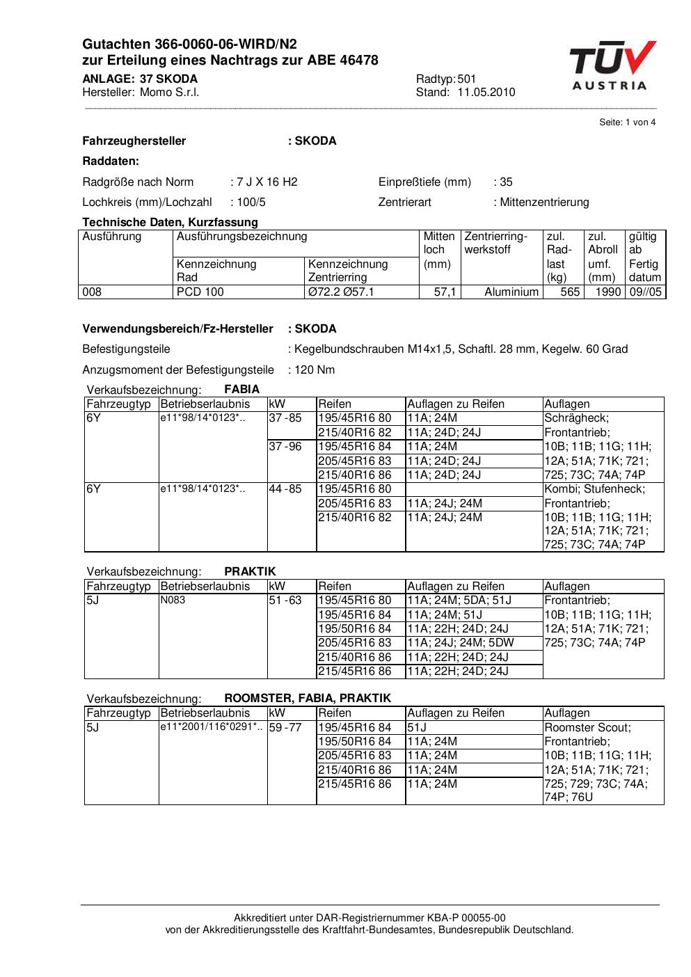Dieses Gutachten (abe) bezieht sich auf die Alufelge brand-momo 501 in der Ausführung 7Jx16 ET 0, Mittenloch 0 mm (KBA 46478). Im PDF findest du typischerweise zulässige Reifengrößen, Auflagen/Anbauhinweise und – je nach Dokument – Hinweise zur Eintragung.