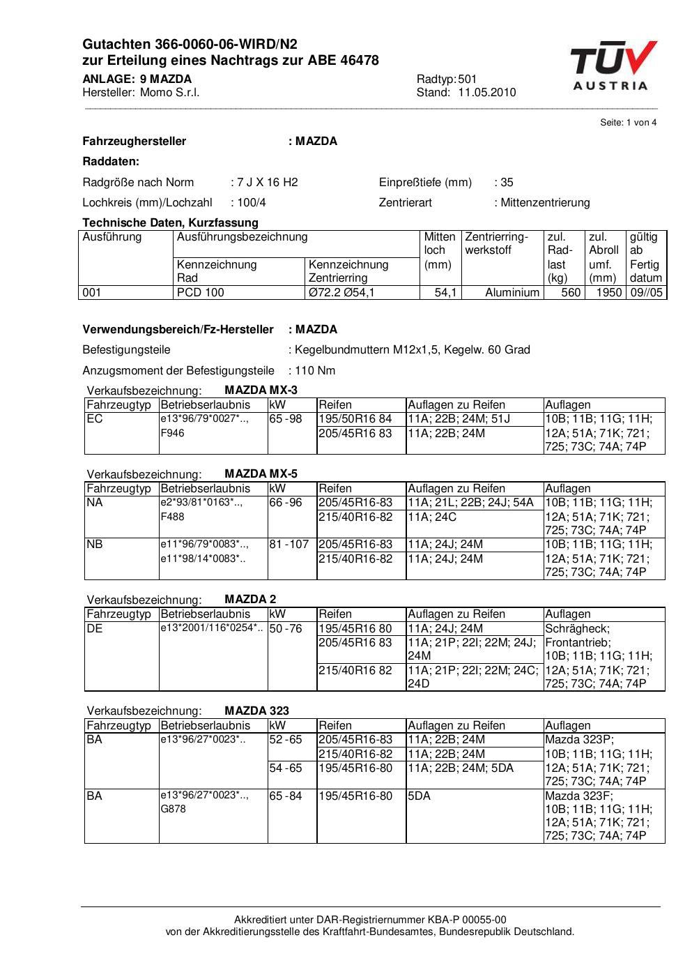 Dieses Gutachten (abe) bezieht sich auf die Alufelge brand-momo 501 in der Ausführung 7Jx16 ET 0, Mittenloch 0 mm (KBA 46478). Im PDF findest du typischerweise zulässige Reifengrößen, Auflagen/Anbauhinweise und – je nach Dokument – Hinweise zur Eintragung.