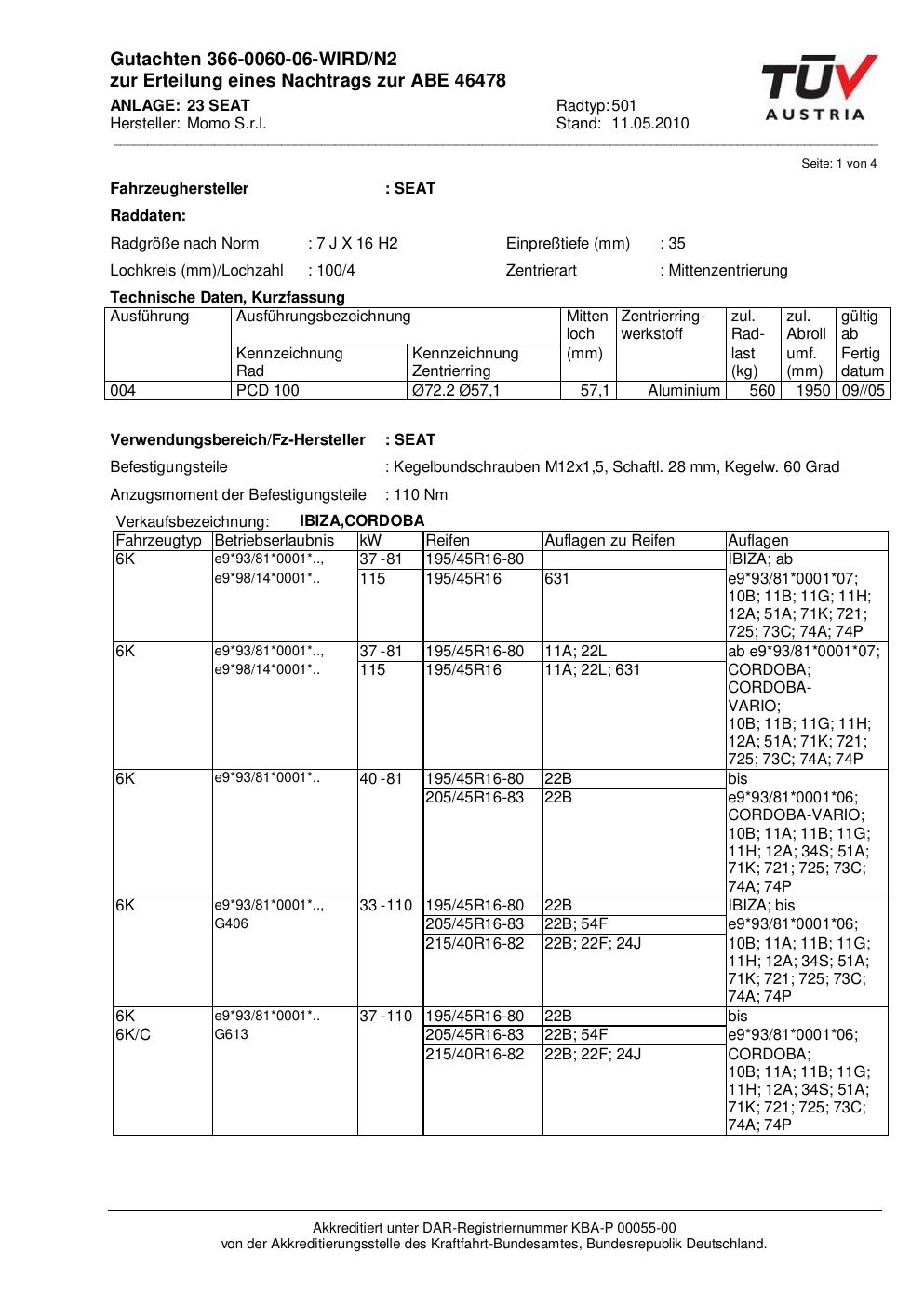 Dieses Gutachten (abe) bezieht sich auf die Alufelge brand-momo 501 in der Ausführung 7Jx16 ET 0, Mittenloch 0 mm (KBA 46478). Im PDF findest du typischerweise zulässige Reifengrößen, Auflagen/Anbauhinweise und – je nach Dokument – Hinweise zur Eintragung.