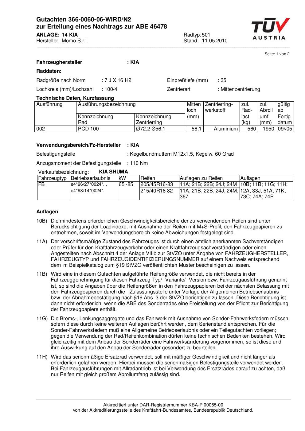 Dieses Gutachten (abe) bezieht sich auf die Alufelge brand-momo 501 in der Ausführung 7Jx16 ET 0, Mittenloch 0 mm (KBA 46478). Im PDF findest du typischerweise zulässige Reifengrößen, Auflagen/Anbauhinweise und – je nach Dokument – Hinweise zur Eintragung.