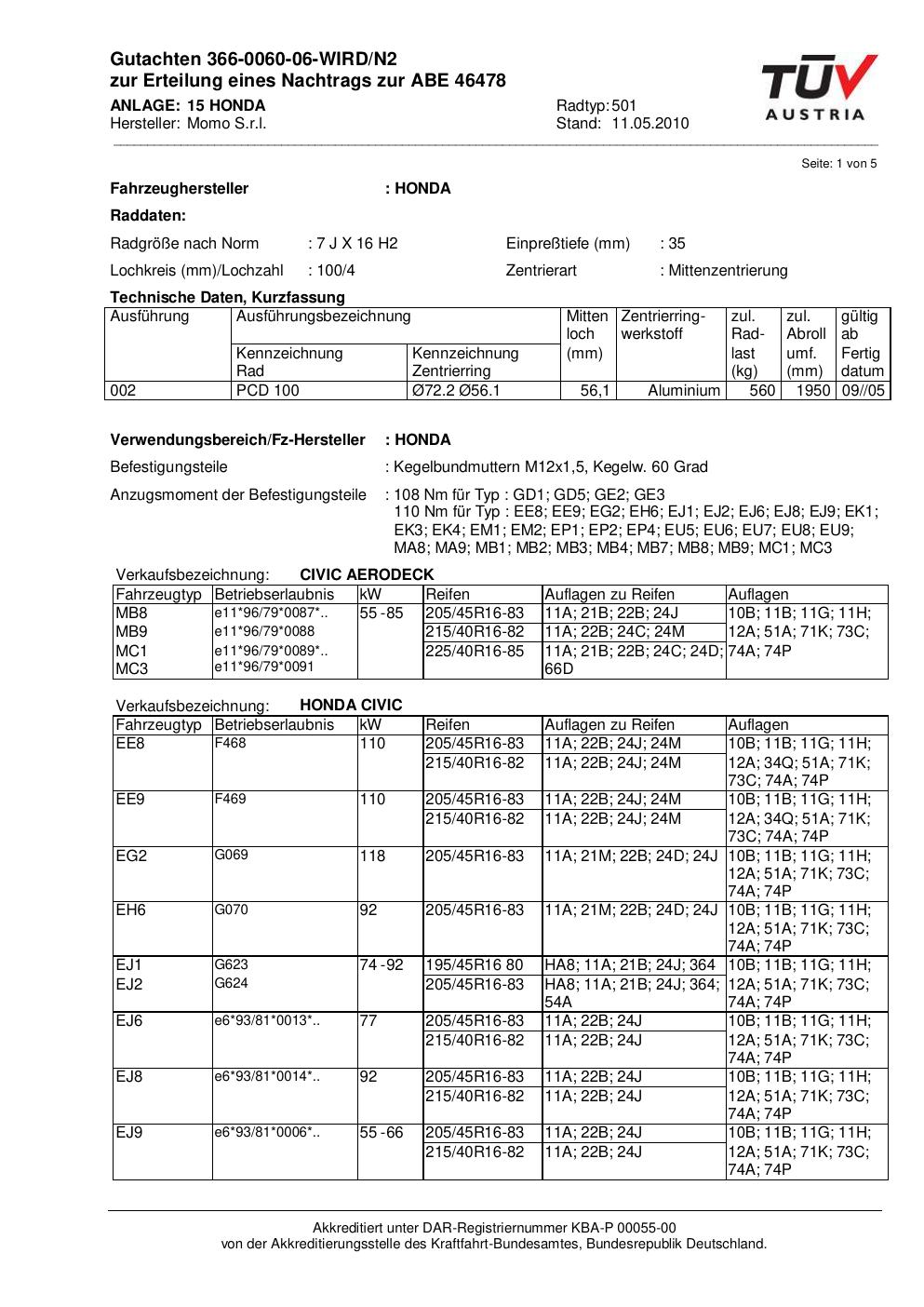 Dieses Gutachten (abe) bezieht sich auf die Alufelge brand-momo 501 in der Ausführung 7Jx16 ET 0, Mittenloch 0 mm (KBA 46478). Im PDF findest du typischerweise zulässige Reifengrößen, Auflagen/Anbauhinweise und – je nach Dokument – Hinweise zur Eintragung.