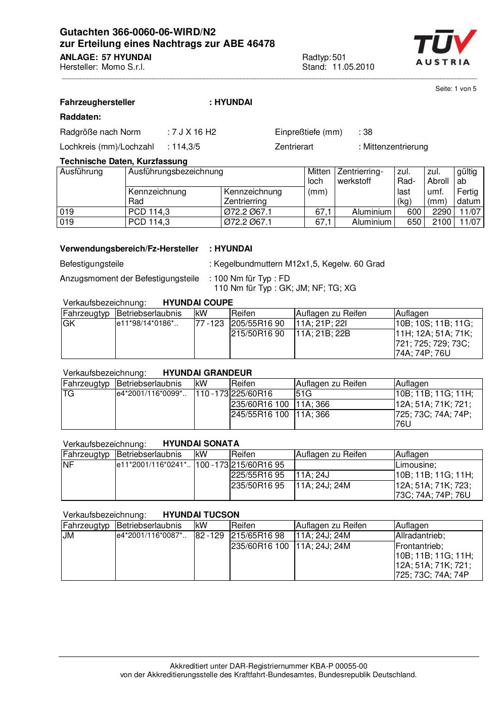 Dieses Gutachten (abe) bezieht sich auf die Alufelge brand-momo 501 in der Ausführung 7Jx16 ET 0, Mittenloch 0 mm (KBA 46478). Im PDF findest du typischerweise zulässige Reifengrößen, Auflagen/Anbauhinweise und – je nach Dokument – Hinweise zur Eintragung.