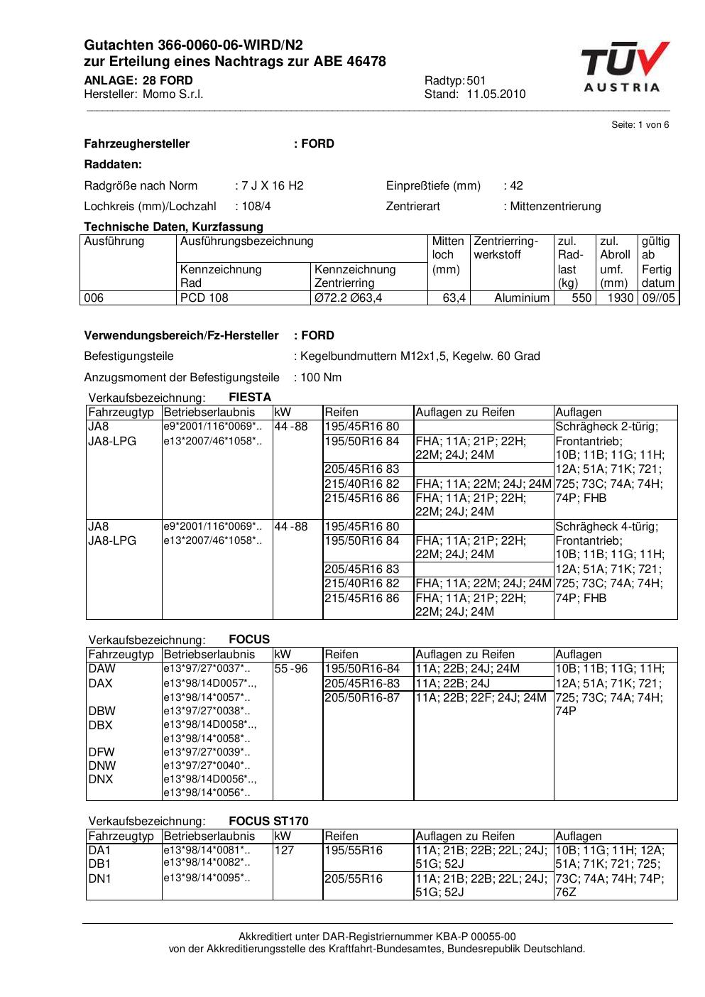 Dieses Gutachten (abe) bezieht sich auf die Alufelge brand-momo 501 in der Ausführung 7Jx16 ET 0, Mittenloch 0 mm (KBA 46478). Im PDF findest du typischerweise zulässige Reifengrößen, Auflagen/Anbauhinweise und – je nach Dokument – Hinweise zur Eintragung.