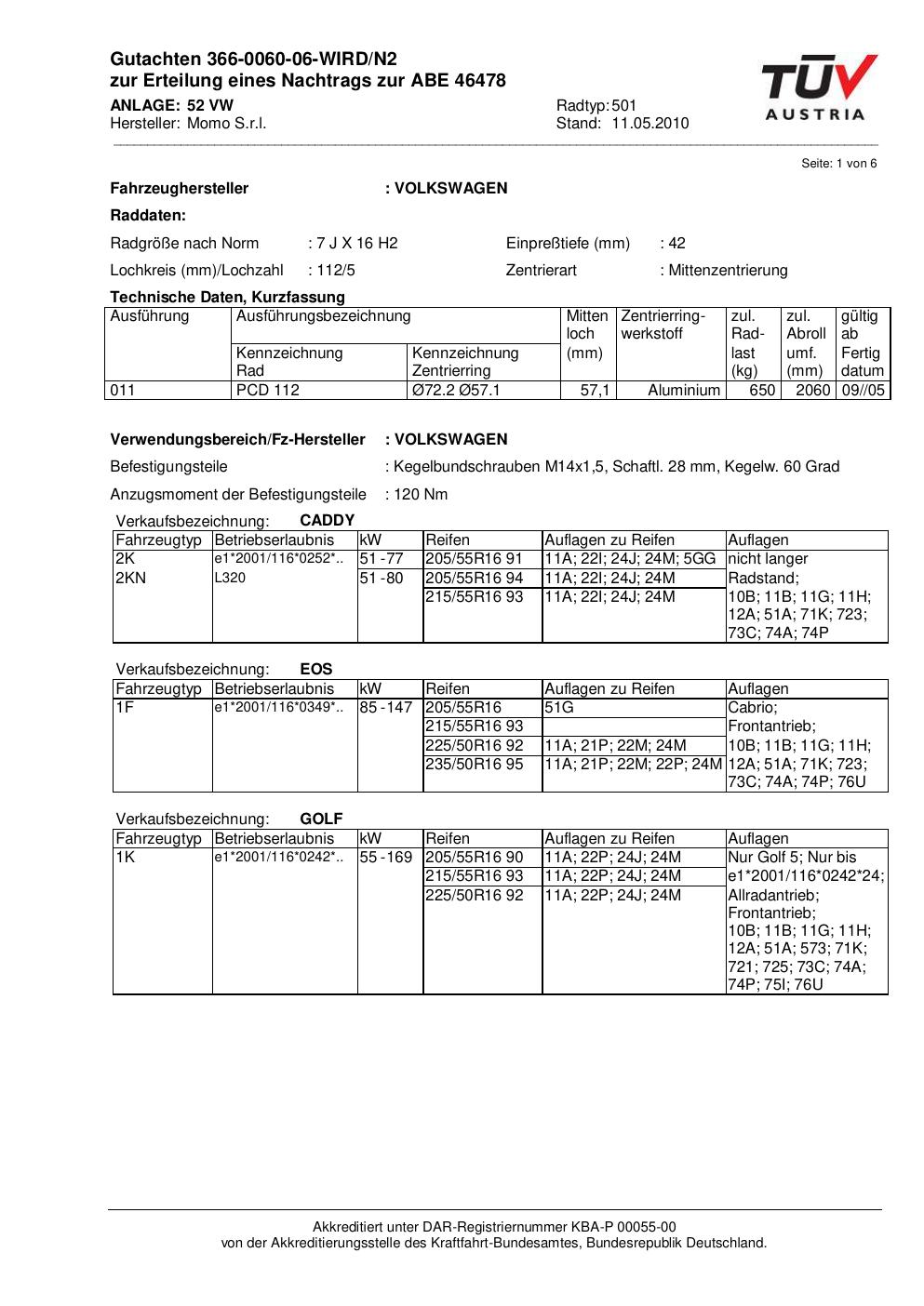 Dieses Gutachten (abe) bezieht sich auf die Alufelge brand-momo 501 in der Ausführung 7Jx16 ET 0, Mittenloch 0 mm (KBA 46478). Im PDF findest du typischerweise zulässige Reifengrößen, Auflagen/Anbauhinweise und – je nach Dokument – Hinweise zur Eintragung.