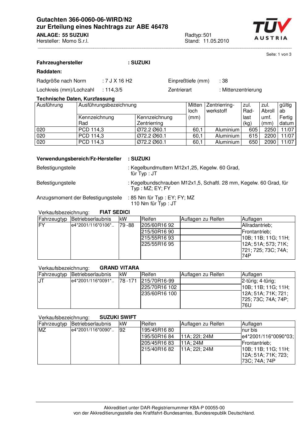 Dieses Gutachten (abe) bezieht sich auf die Alufelge brand-momo 501 in der Ausführung 7Jx16 ET 0, Mittenloch 0 mm (KBA 46478). Im PDF findest du typischerweise zulässige Reifengrößen, Auflagen/Anbauhinweise und – je nach Dokument – Hinweise zur Eintragung.