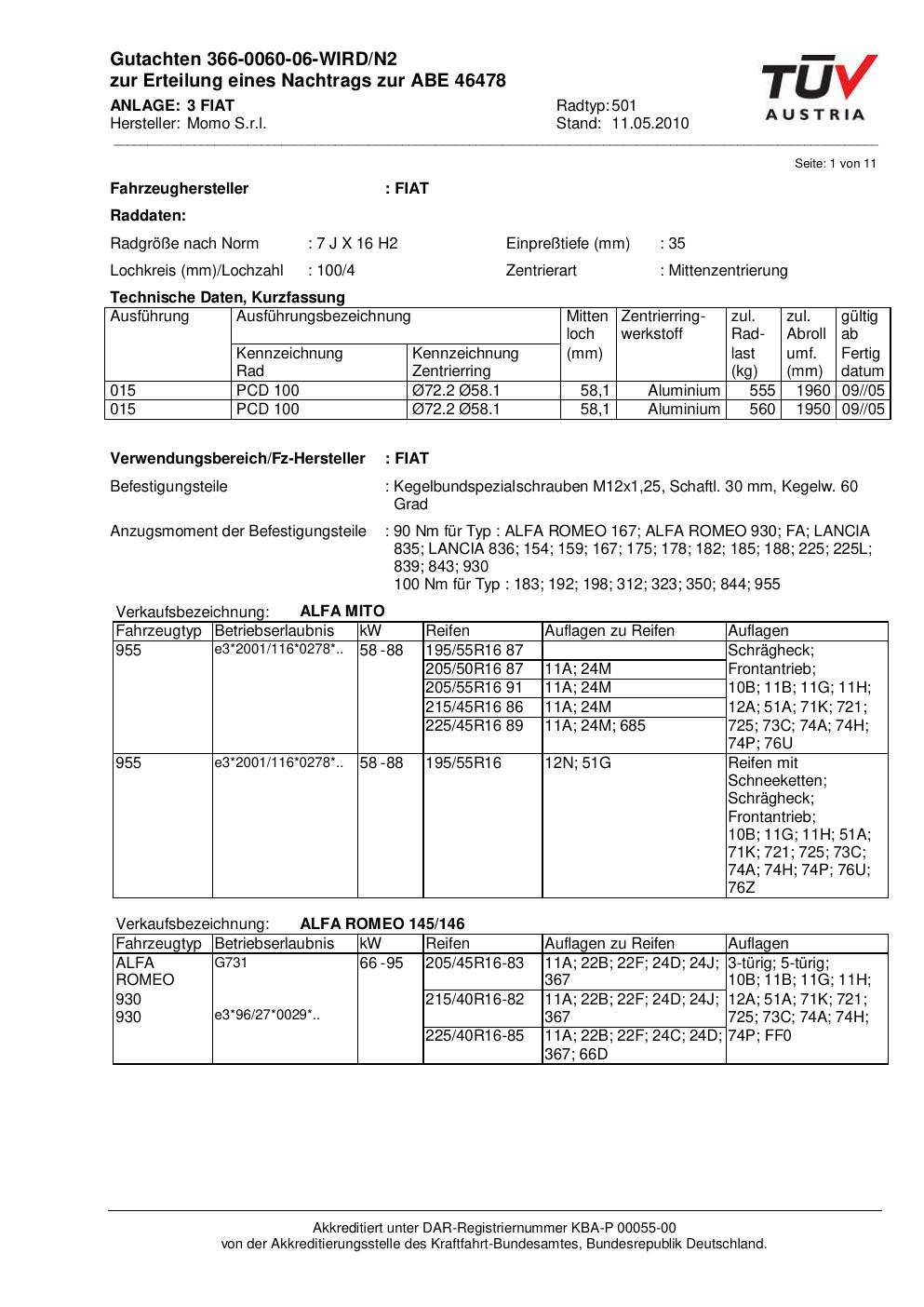 Dieses Gutachten (abe) bezieht sich auf die Alufelge brand-momo 501 in der Ausführung 7Jx16 ET 0, Mittenloch 0 mm (KBA 46478). Im PDF findest du typischerweise zulässige Reifengrößen, Auflagen/Anbauhinweise und – je nach Dokument – Hinweise zur Eintragung.