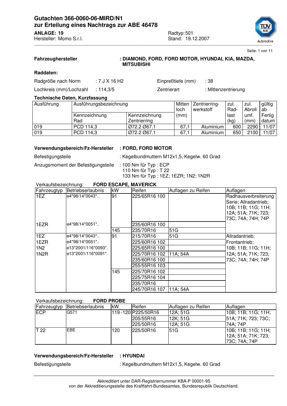 Dieses Gutachten (abe) bezieht sich auf die Alufelge brand-momo 501 in der Ausführung 7Jx16 ET 0, Mittenloch 0 mm (KBA 46478). Im PDF findest du typischerweise zulässige Reifengrößen, Auflagen/Anbauhinweise und – je nach Dokument – Hinweise zur Eintragung.