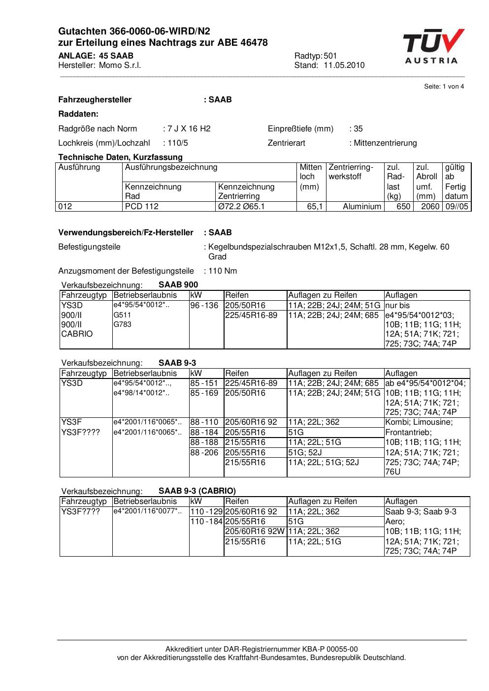 Dieses Gutachten (abe) bezieht sich auf die Alufelge brand-momo 501 in der Ausführung 7Jx16 ET 0, Mittenloch 0 mm (KBA 46478). Im PDF findest du typischerweise zulässige Reifengrößen, Auflagen/Anbauhinweise und – je nach Dokument – Hinweise zur Eintragung.