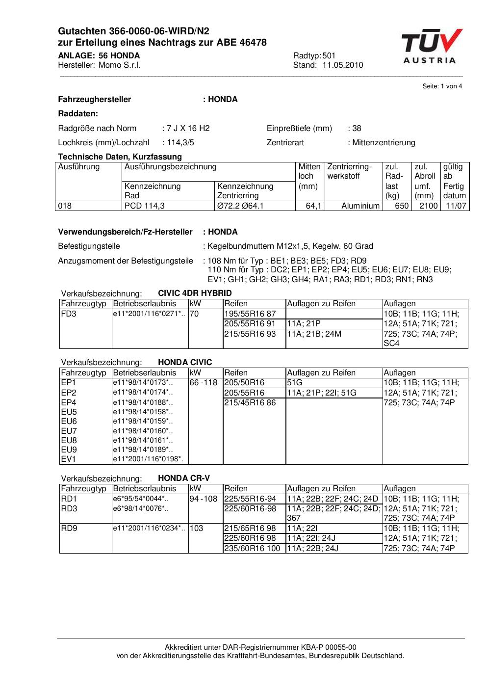 Dieses Gutachten (abe) bezieht sich auf die Alufelge brand-momo 501 in der Ausführung 7Jx16 ET 0, Mittenloch 0 mm (KBA 46478). Im PDF findest du typischerweise zulässige Reifengrößen, Auflagen/Anbauhinweise und – je nach Dokument – Hinweise zur Eintragung.