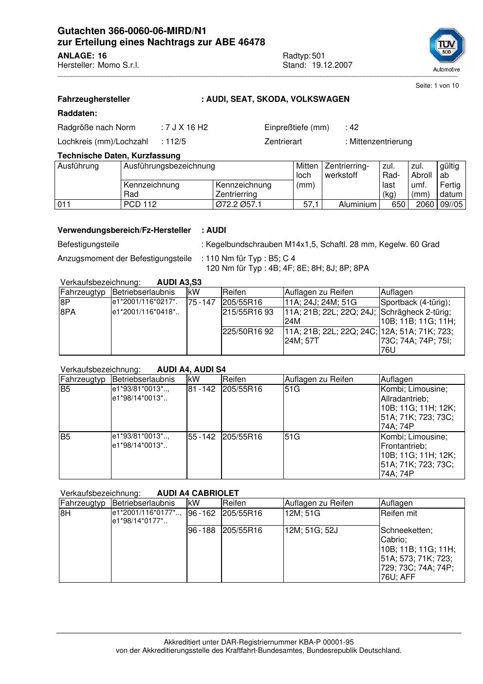 Dieses Gutachten (abe) bezieht sich auf die Alufelge Momo 501 in der Ausführung 7Jx16 ET 0, Mittenloch 0 mm (KBA 46478). Im PDF findest du typischerweise zulässige Reifengrößen, Auflagen/Anbauhinweise und – je nach Dokument – Hinweise zur Eintragung.