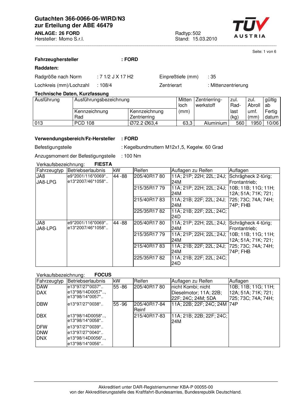 Dieses Gutachten (abe) bezieht sich auf die Alufelge brand-momo 502 in der Ausführung 2Jx17 ET 0, Mittenloch 0 mm (KBA 46479). Im PDF findest du typischerweise zulässige Reifengrößen, Auflagen/Anbauhinweise und – je nach Dokument – Hinweise zur Eintragung.