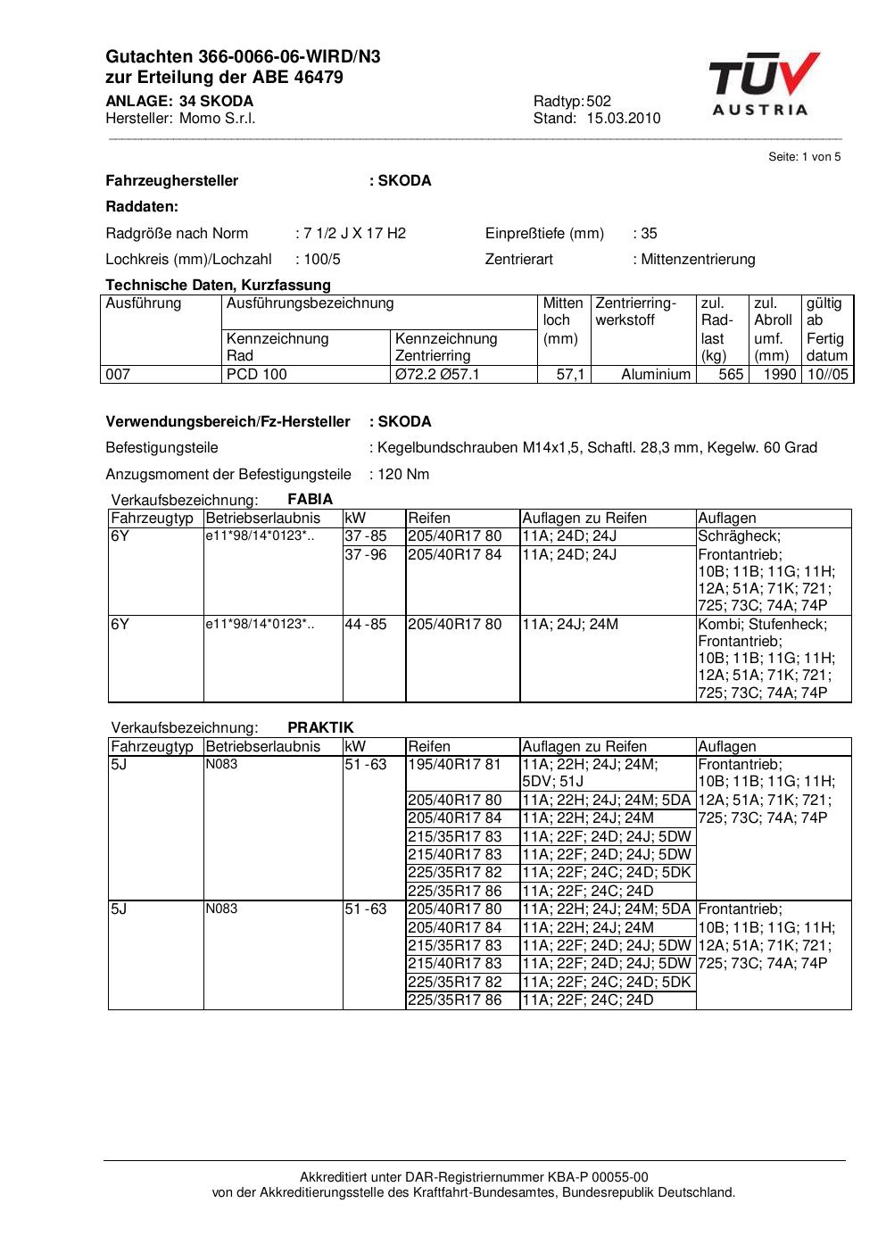 Dieses Gutachten (abe) bezieht sich auf die Alufelge brand-momo 502 in der Ausführung 2Jx17 ET 0, Mittenloch 0 mm (KBA 46479). Im PDF findest du typischerweise zulässige Reifengrößen, Auflagen/Anbauhinweise und – je nach Dokument – Hinweise zur Eintragung.