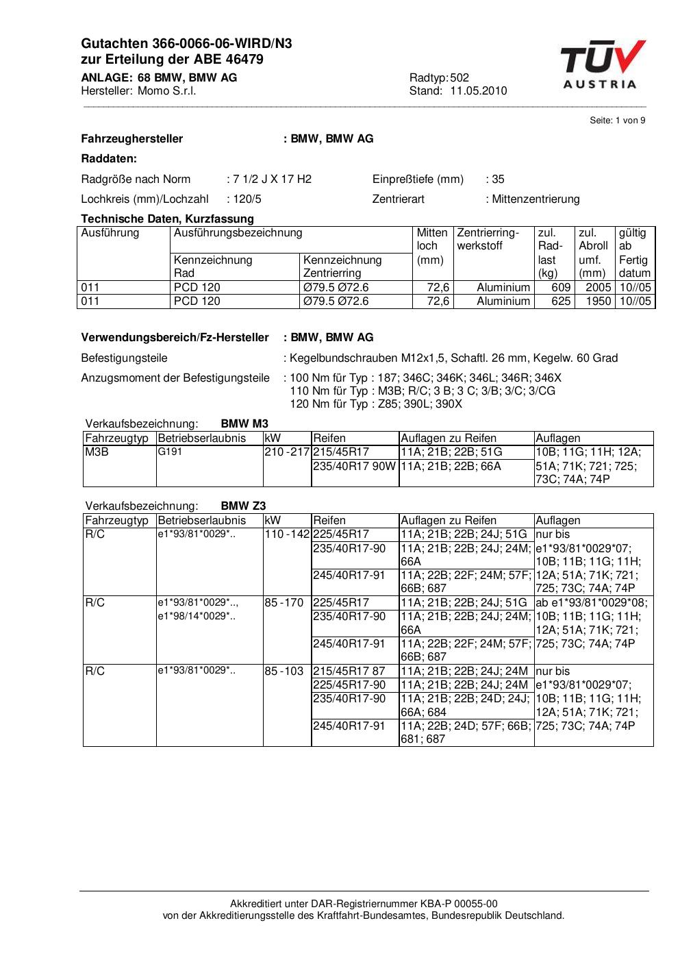 Dieses Gutachten (abe) bezieht sich auf die Alufelge brand-momo 502 in der Ausführung 2Jx17 ET 0, Mittenloch 0 mm (KBA 46479). Im PDF findest du typischerweise zulässige Reifengrößen, Auflagen/Anbauhinweise und – je nach Dokument – Hinweise zur Eintragung.