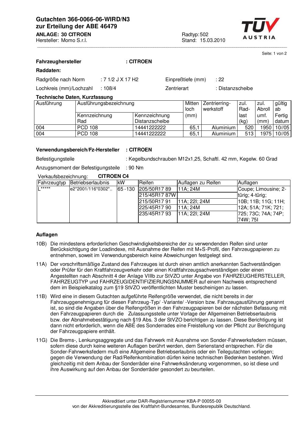 Dieses Gutachten (abe) bezieht sich auf die Alufelge brand-momo 502 in der Ausführung 2Jx17 ET 0, Mittenloch 0 mm (KBA 46479). Im PDF findest du typischerweise zulässige Reifengrößen, Auflagen/Anbauhinweise und – je nach Dokument – Hinweise zur Eintragung.