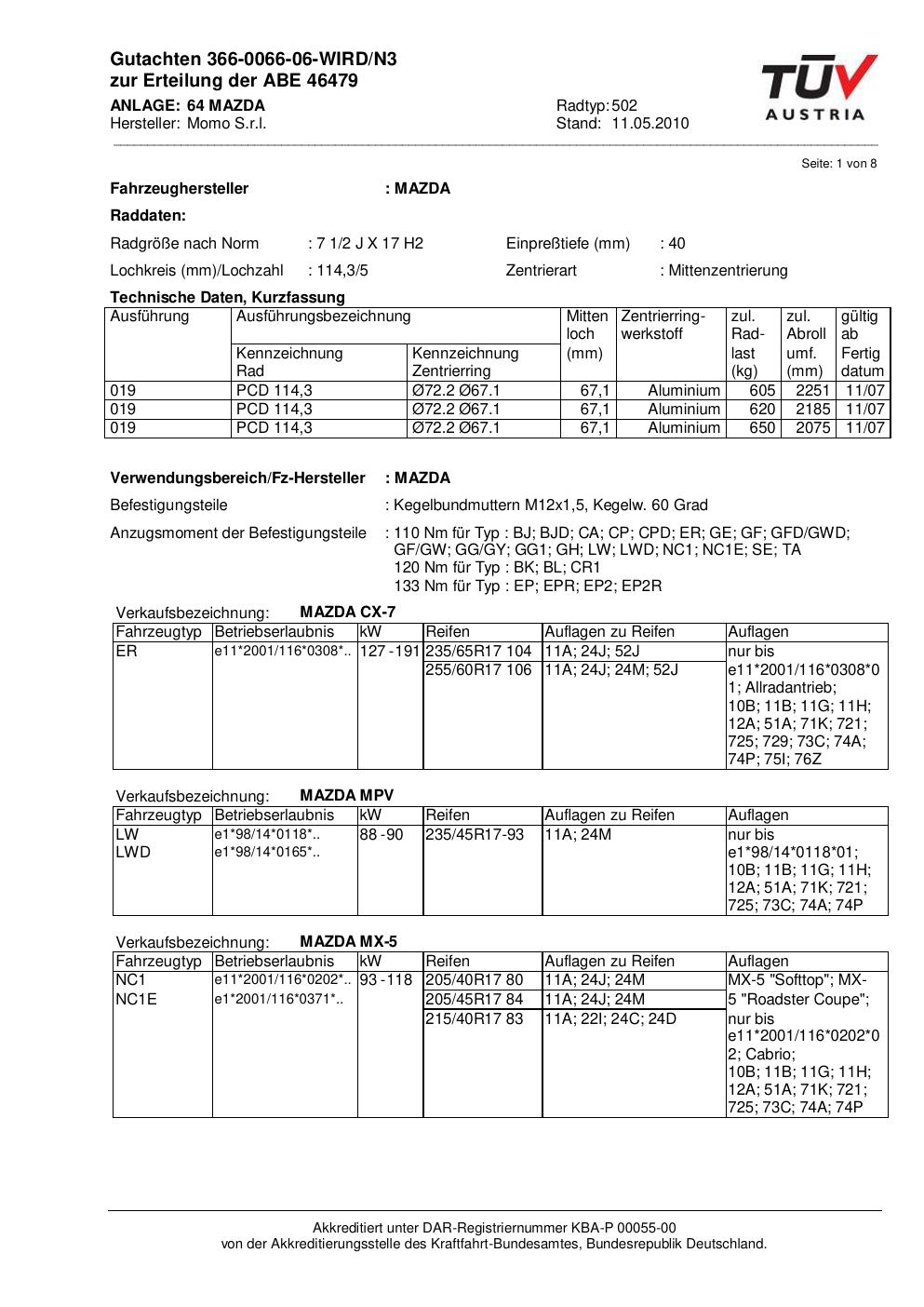 Dieses Gutachten (abe) bezieht sich auf die Alufelge brand-momo 502 in der Ausführung 2Jx17 ET 0, Mittenloch 0 mm (KBA 46479). Im PDF findest du typischerweise zulässige Reifengrößen, Auflagen/Anbauhinweise und – je nach Dokument – Hinweise zur Eintragung.