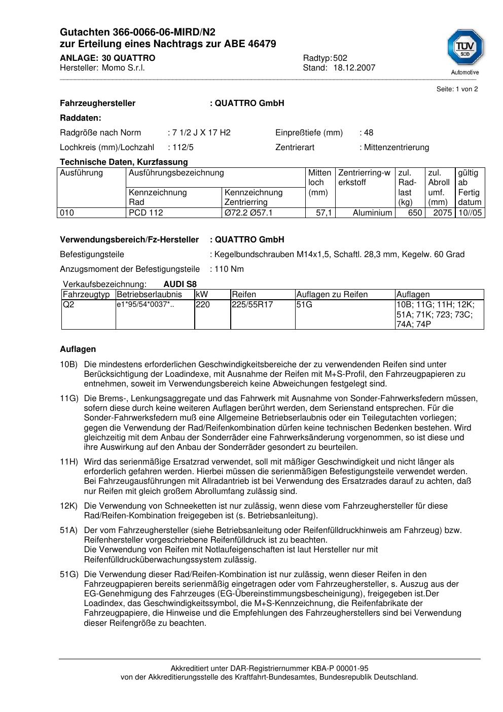 Dieses Gutachten (abe) bezieht sich auf die Alufelge brand-momo 502 in der Ausführung 2Jx17 ET 0, Mittenloch 0 mm (KBA 46479). Im PDF findest du typischerweise zulässige Reifengrößen, Auflagen/Anbauhinweise und – je nach Dokument – Hinweise zur Eintragung.
