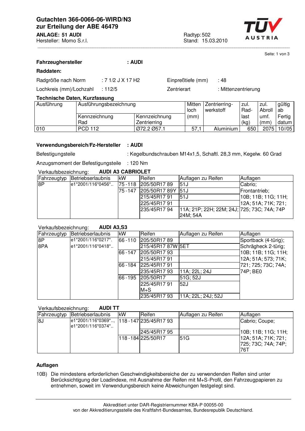 Dieses Gutachten (abe) bezieht sich auf die Alufelge brand-momo 502 in der Ausführung 2Jx17 ET 0, Mittenloch 0 mm (KBA 46479). Im PDF findest du typischerweise zulässige Reifengrößen, Auflagen/Anbauhinweise und – je nach Dokument – Hinweise zur Eintragung.