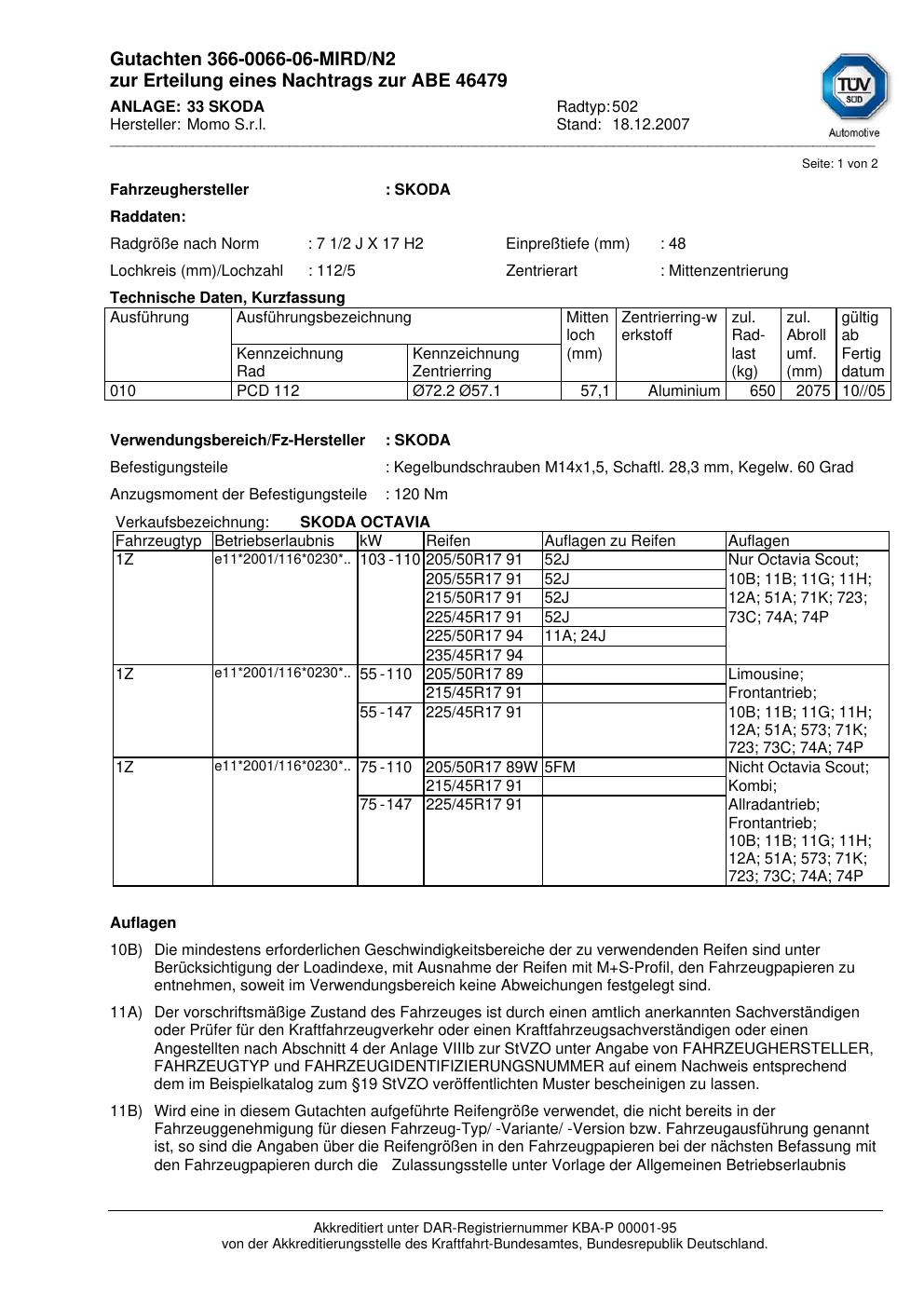 Dieses Gutachten (abe) bezieht sich auf die Alufelge brand-momo 502 in der Ausführung 2Jx17 ET 0, Mittenloch 0 mm (KBA 46479). Im PDF findest du typischerweise zulässige Reifengrößen, Auflagen/Anbauhinweise und – je nach Dokument – Hinweise zur Eintragung.