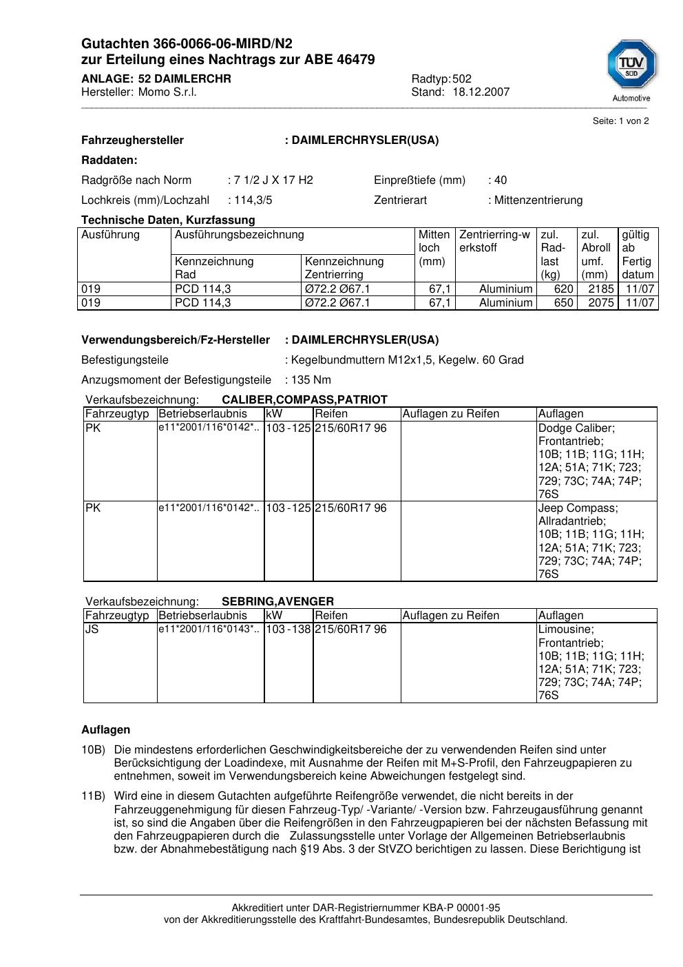 Dieses Gutachten (abe) bezieht sich auf die Alufelge brand-momo 502 in der Ausführung 2Jx17 ET 0, Mittenloch 0 mm (KBA 46479). Im PDF findest du typischerweise zulässige Reifengrößen, Auflagen/Anbauhinweise und – je nach Dokument – Hinweise zur Eintragung.