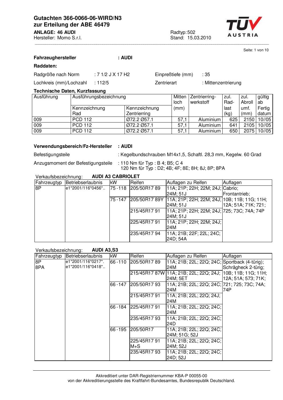 Dieses Gutachten (abe) bezieht sich auf die Alufelge brand-momo 502 in der Ausführung 2Jx17 ET 0, Mittenloch 0 mm (KBA 46479). Im PDF findest du typischerweise zulässige Reifengrößen, Auflagen/Anbauhinweise und – je nach Dokument – Hinweise zur Eintragung.