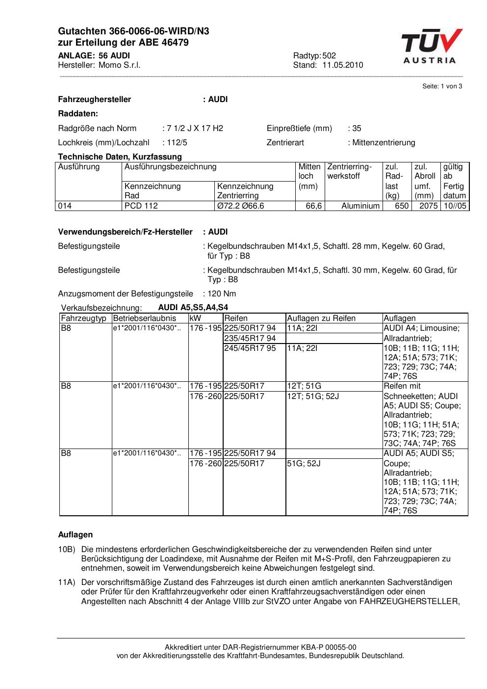 Dieses Gutachten (abe) bezieht sich auf die Alufelge brand-momo 502 in der Ausführung 2Jx17 ET 0, Mittenloch 0 mm (KBA 46479). Im PDF findest du typischerweise zulässige Reifengrößen, Auflagen/Anbauhinweise und – je nach Dokument – Hinweise zur Eintragung.