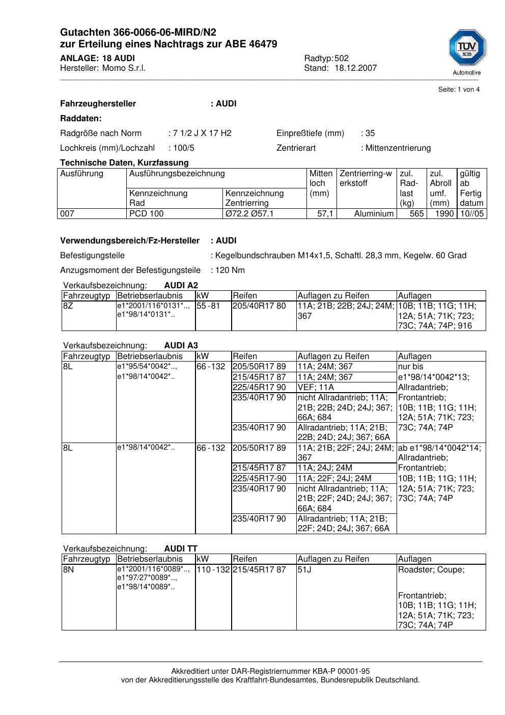 Dieses Gutachten (abe) bezieht sich auf die Alufelge brand-momo 502 in der Ausführung 2Jx17 ET 0, Mittenloch 0 mm (KBA 46479). Im PDF findest du typischerweise zulässige Reifengrößen, Auflagen/Anbauhinweise und – je nach Dokument – Hinweise zur Eintragung.