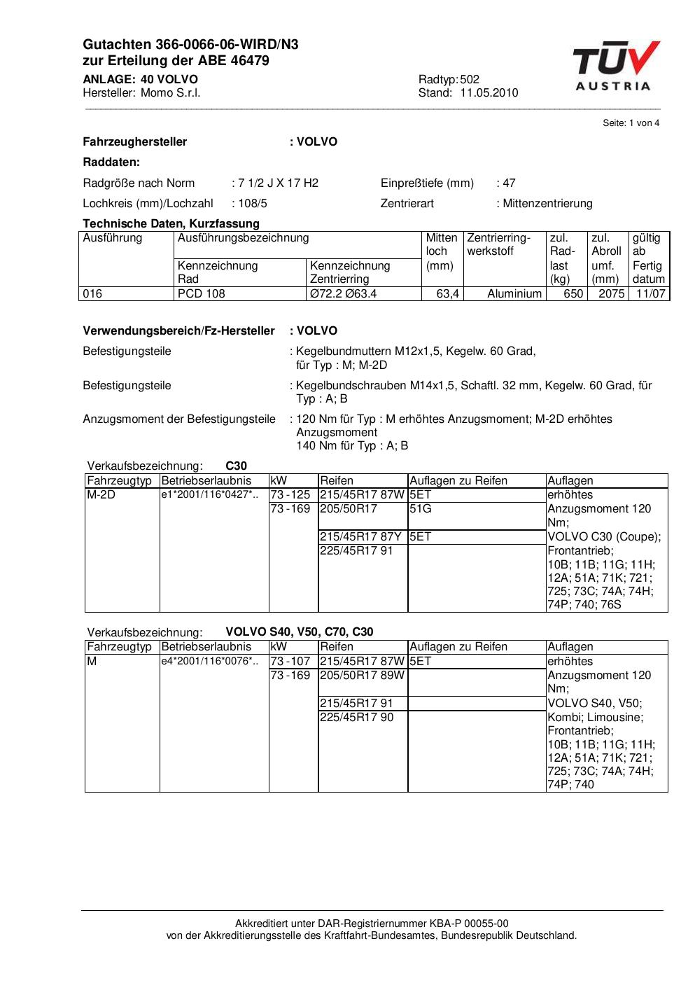 Dieses Gutachten (abe) bezieht sich auf die Alufelge brand-momo 502 in der Ausführung 2Jx17 ET 0, Mittenloch 0 mm (KBA 46479). Im PDF findest du typischerweise zulässige Reifengrößen, Auflagen/Anbauhinweise und – je nach Dokument – Hinweise zur Eintragung.