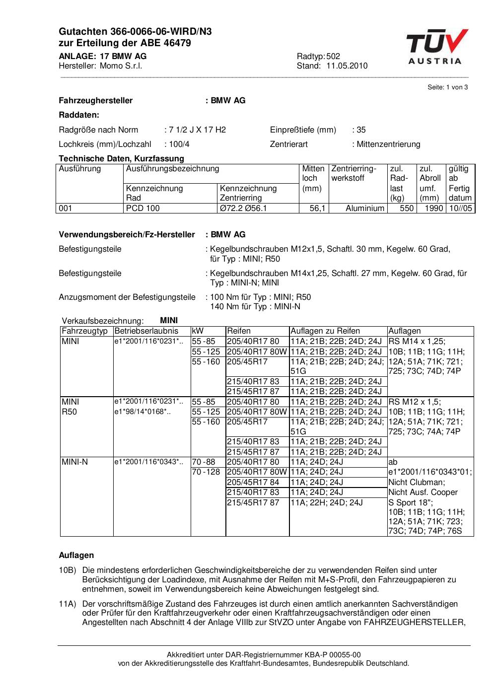 Dieses Gutachten (abe) bezieht sich auf die Alufelge brand-momo 502 in der Ausführung 2Jx17 ET 0, Mittenloch 0 mm (KBA 46479). Im PDF findest du typischerweise zulässige Reifengrößen, Auflagen/Anbauhinweise und – je nach Dokument – Hinweise zur Eintragung.