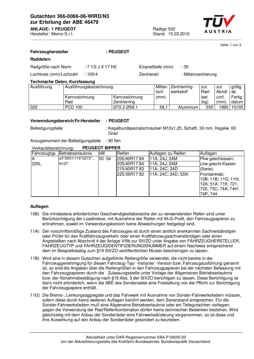 Dieses Gutachten (abe) bezieht sich auf die Alufelge brand-momo 502 in der Ausführung 2Jx17 ET 0, Mittenloch 0 mm (KBA 46479). Im PDF findest du typischerweise zulässige Reifengrößen, Auflagen/Anbauhinweise und – je nach Dokument – Hinweise zur Eintragung.
