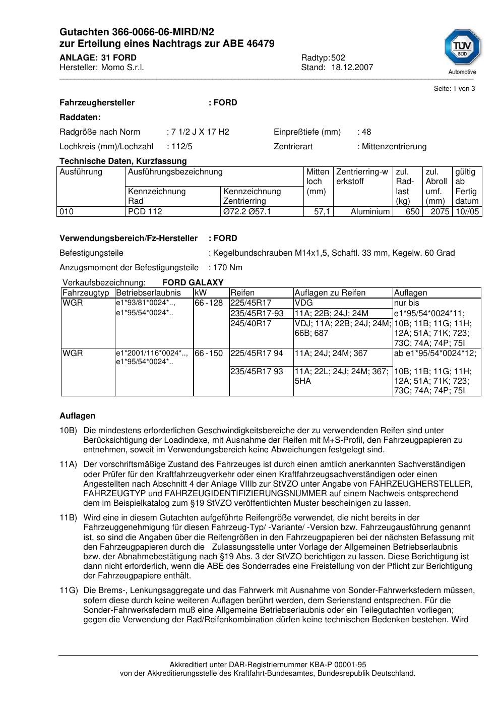 Dieses Gutachten (abe) bezieht sich auf die Alufelge brand-momo 502 in der Ausführung 2Jx17 ET 0, Mittenloch 0 mm (KBA 46479). Im PDF findest du typischerweise zulässige Reifengrößen, Auflagen/Anbauhinweise und – je nach Dokument – Hinweise zur Eintragung.