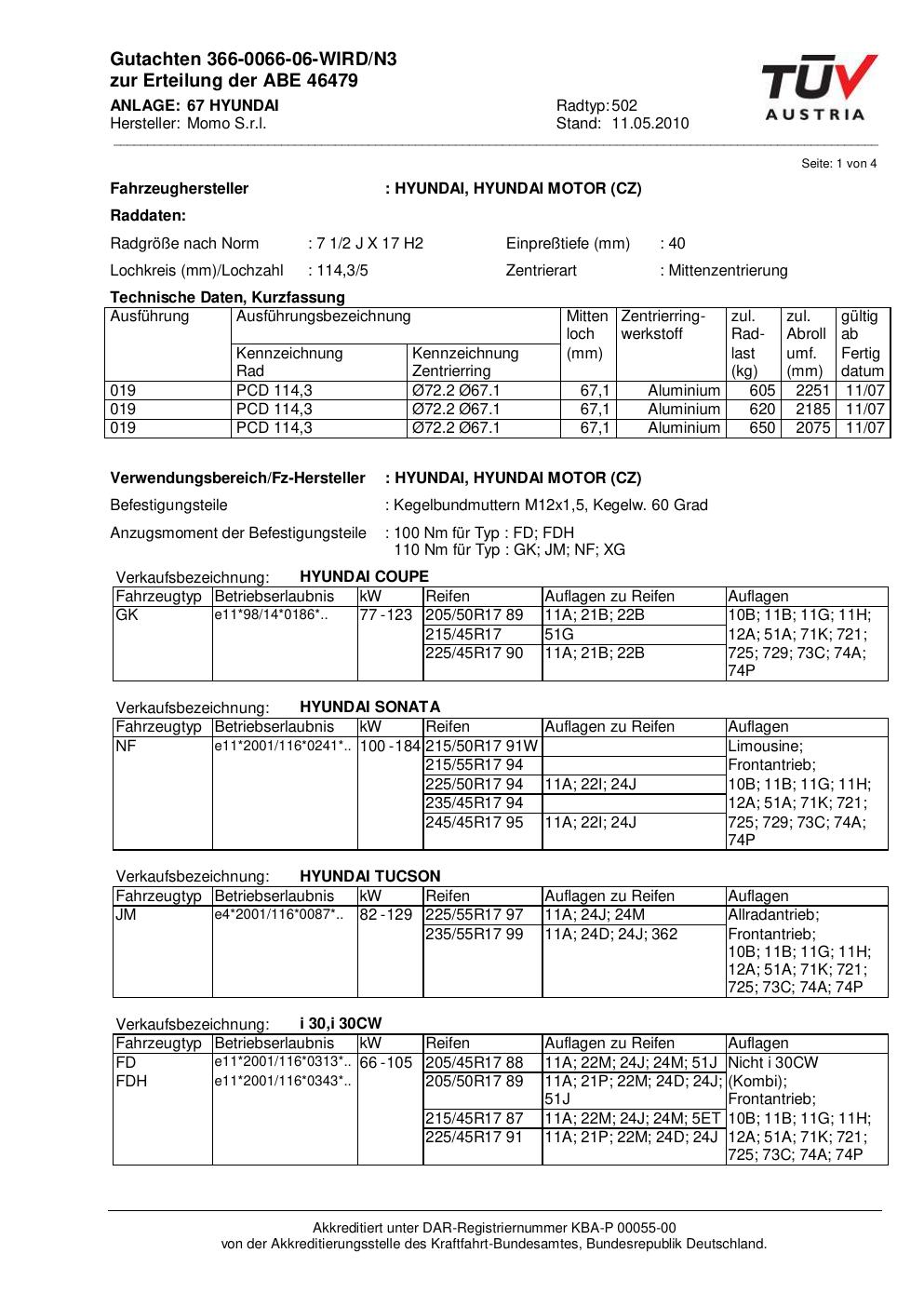 Dieses Gutachten (abe) bezieht sich auf die Alufelge brand-momo 502 in der Ausführung 2Jx17 ET 0, Mittenloch 0 mm (KBA 46479). Im PDF findest du typischerweise zulässige Reifengrößen, Auflagen/Anbauhinweise und – je nach Dokument – Hinweise zur Eintragung.